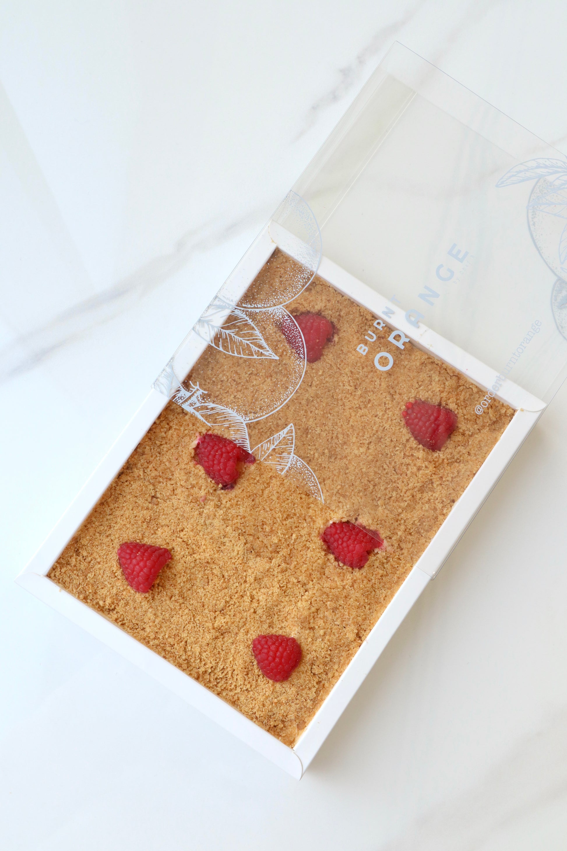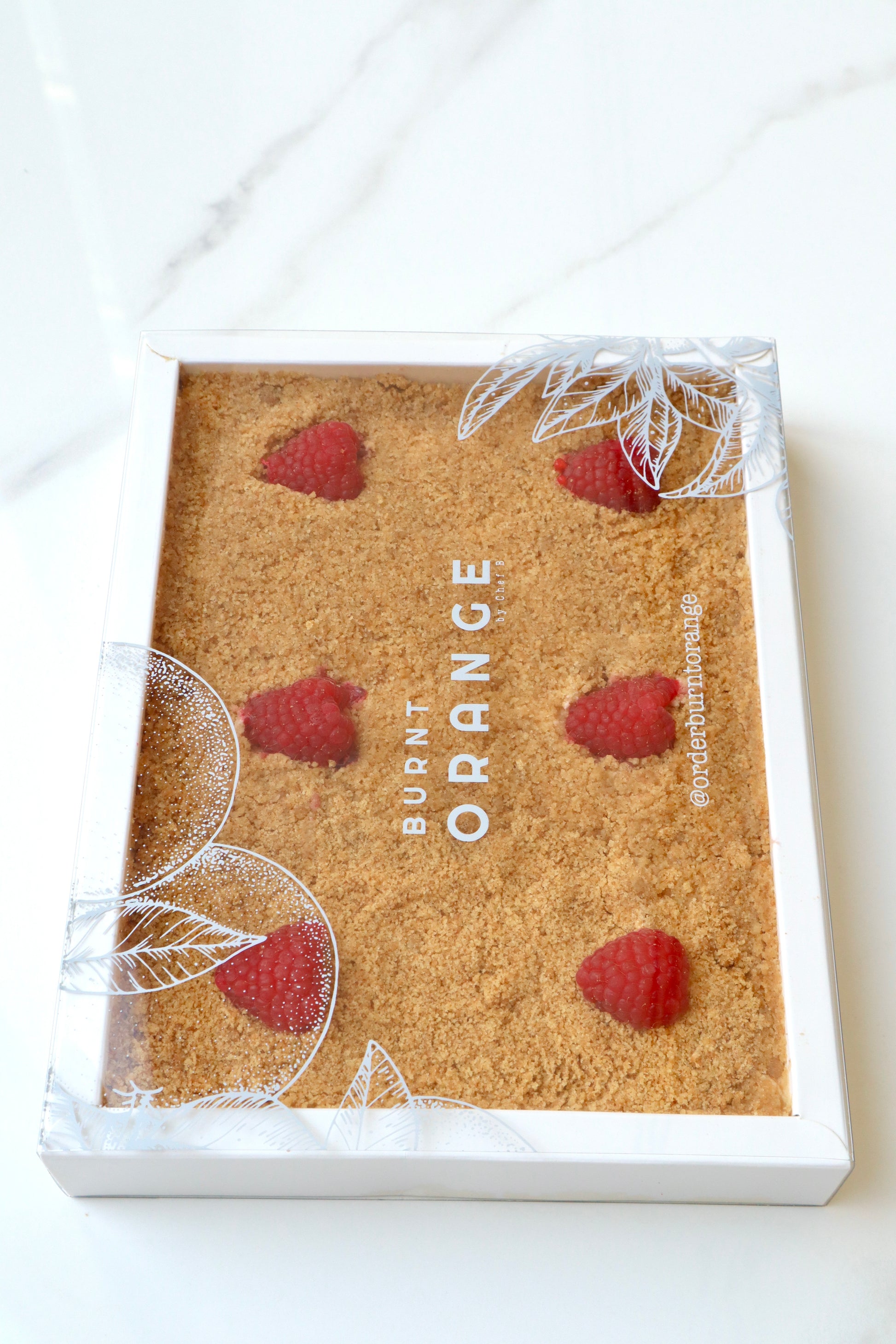 Layers of a delicious vanilla filling and crumbled biscuits topped with fresh raspberries.