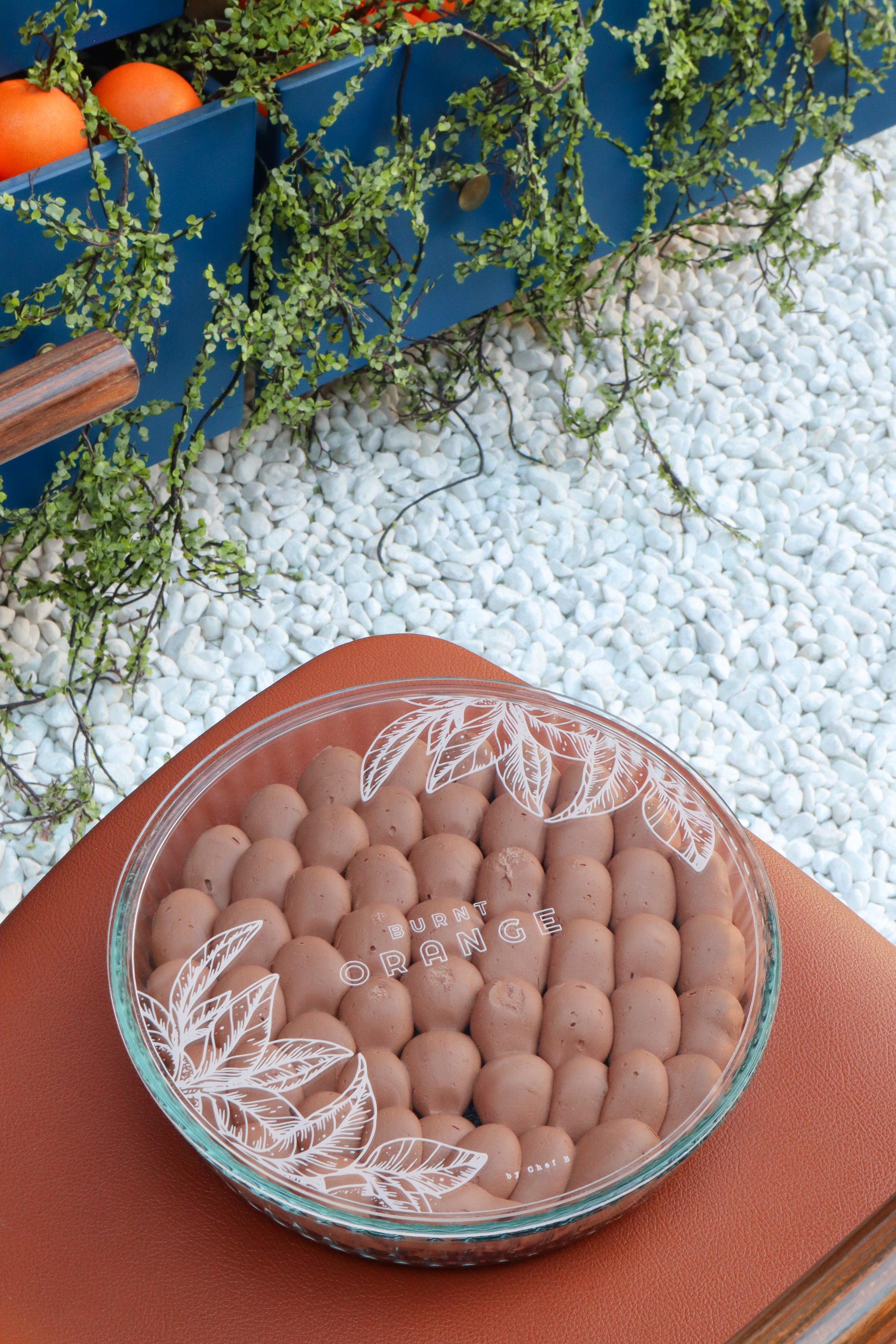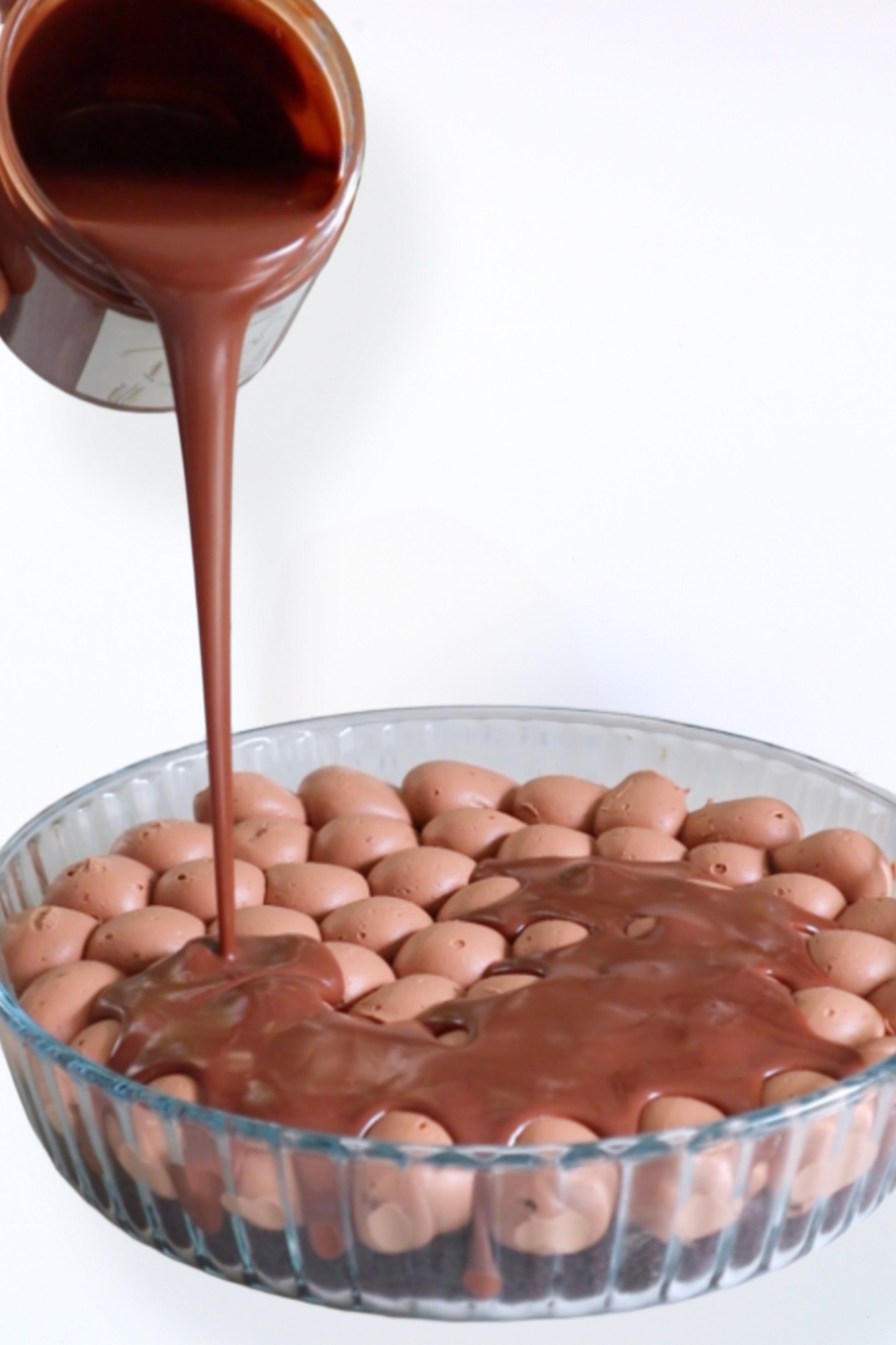This chocolate cake is topped with a ganache frosting, and is served alongside a hot chocolate sauce. It serves up to 15 people.