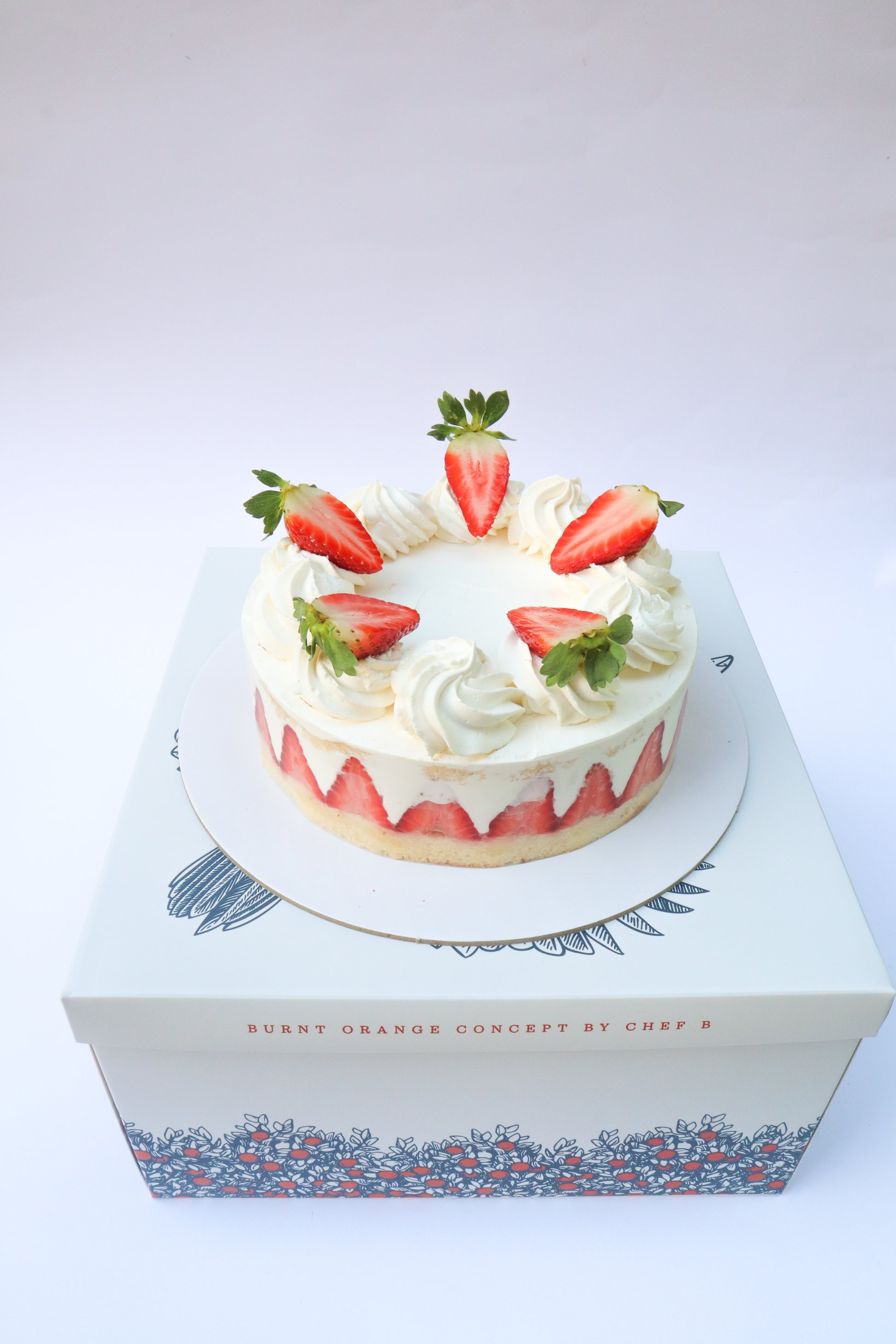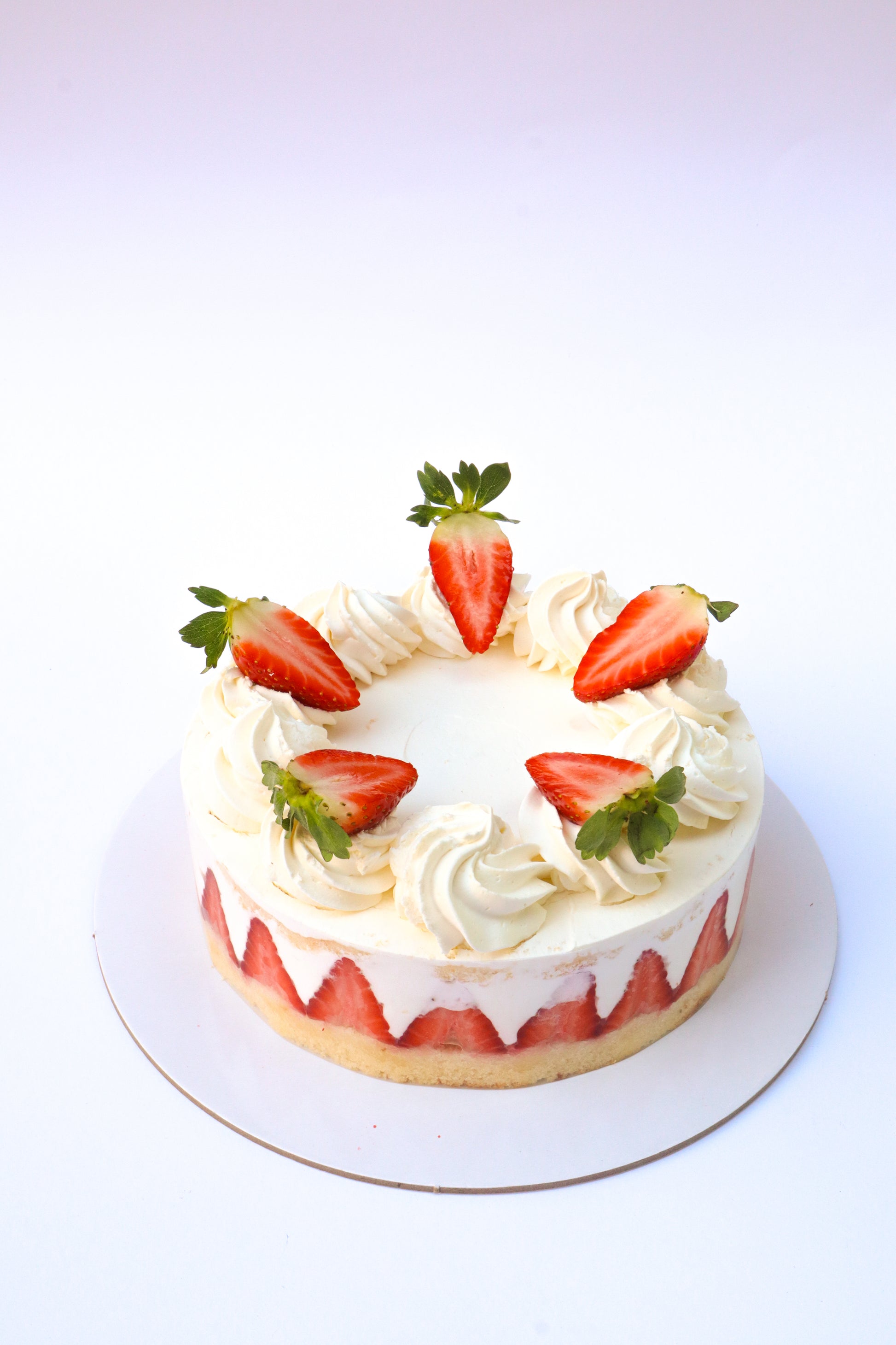 Rose water sponge, fresh strawberries, whipped cream and a custard filling.