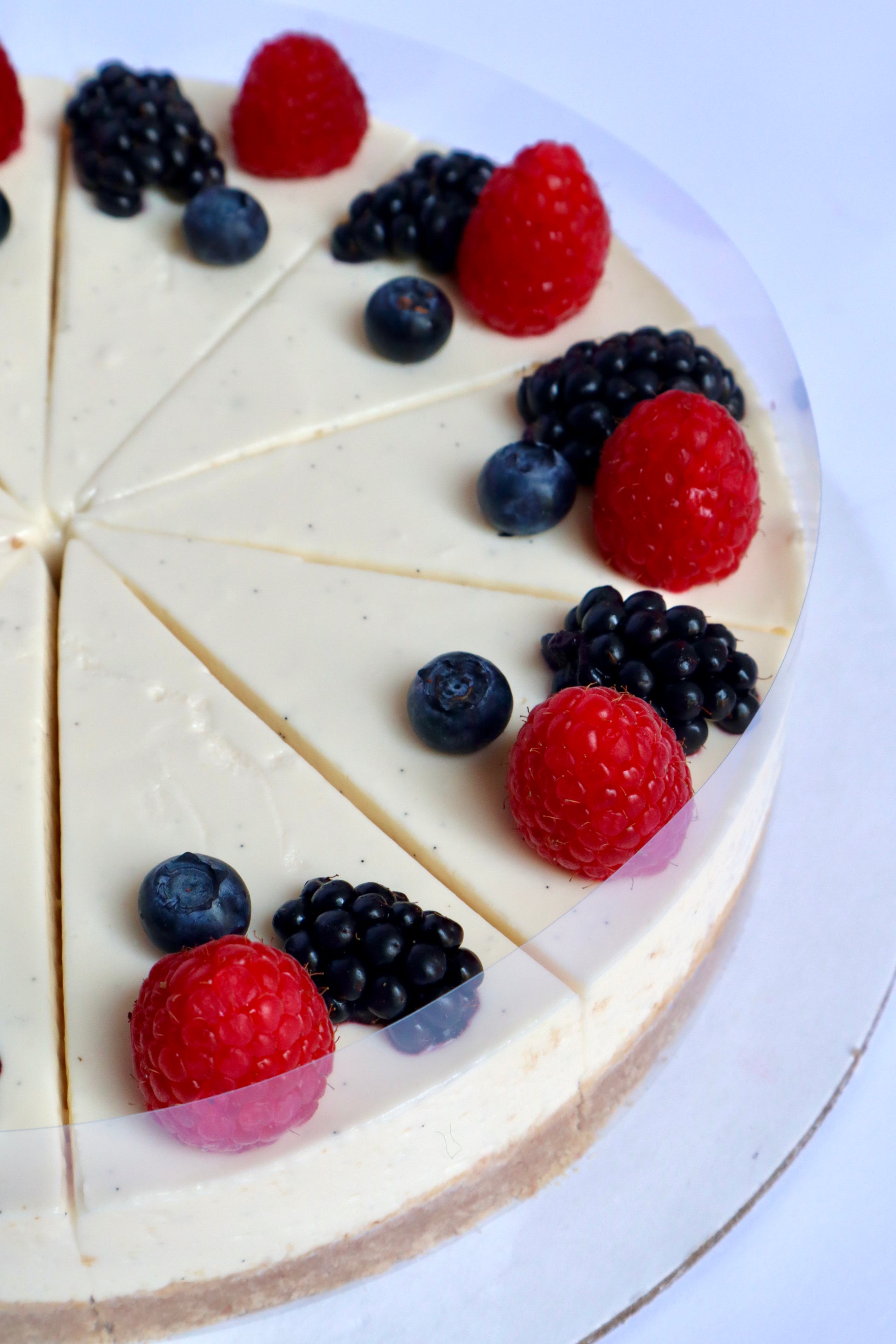 Vanilla bean cheesecake, biscuit base & fresh berries garnish.
